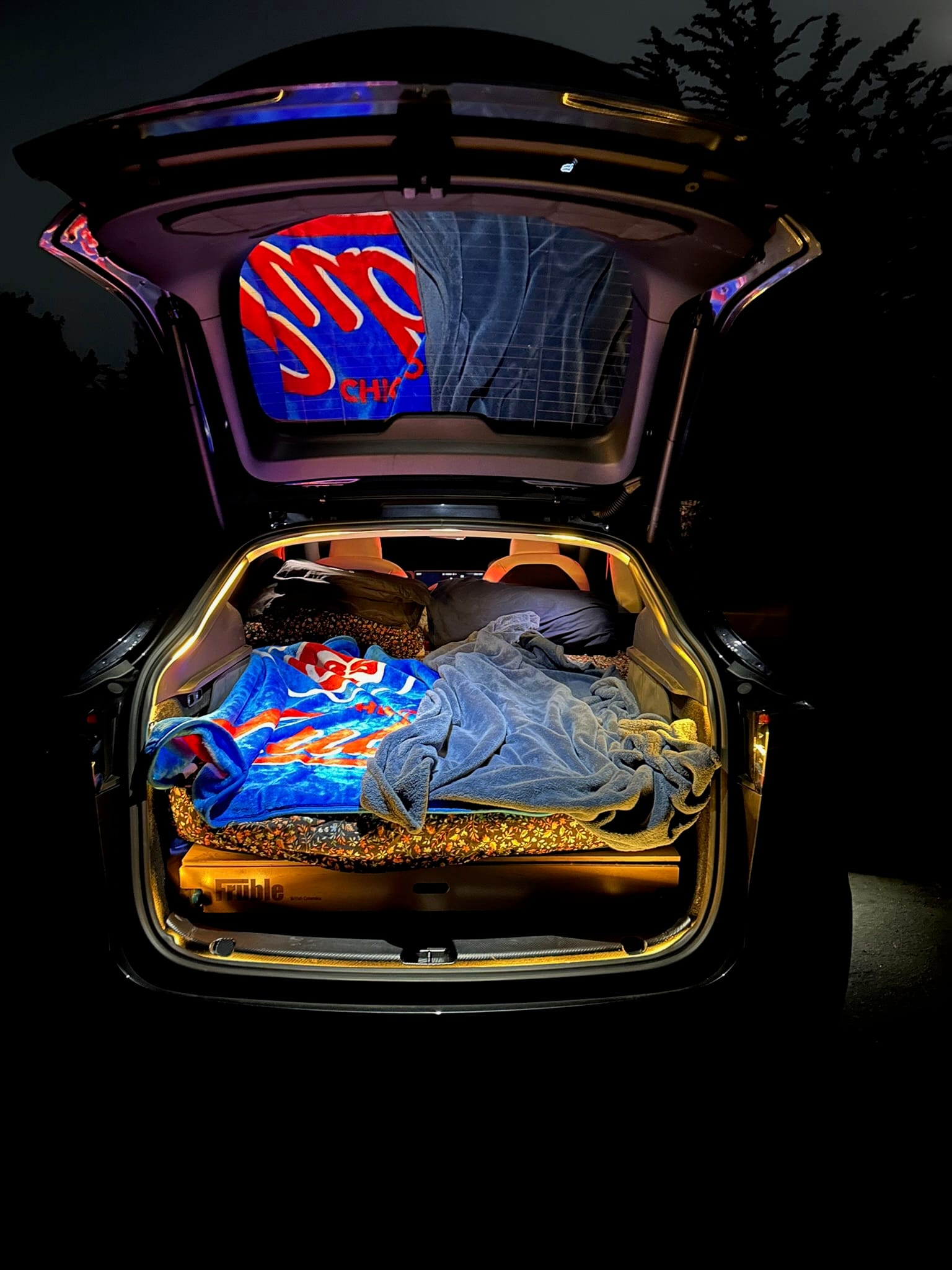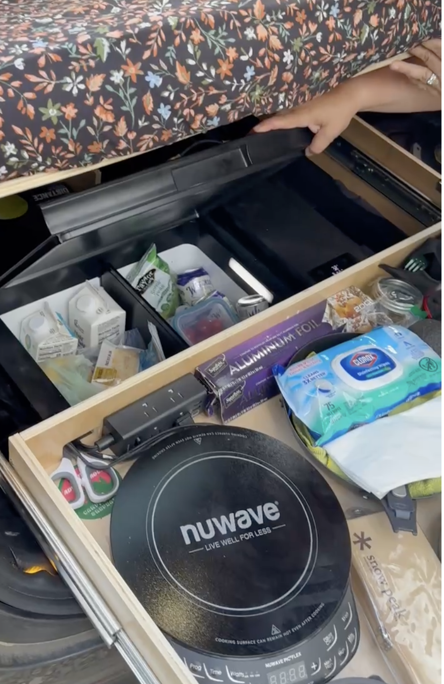 Tesla Y has a super cool feature called "camp mode" which keeps the car temperature controlled and keeps the airflow moving. There's also a lot of custom features that Tesla and other companies make to make a cool experience. Like, black out window shades, a fitted blow up mattress, off-roading wheels, a fridge to fit under the back storage area, a platform for sleeping, etc. One of the other game changing things he did right off the bat was to get a "Fruble." It's a custom build drawer system that allowed us to have a streamline camp setup under our bed. I'll get to that in a second.