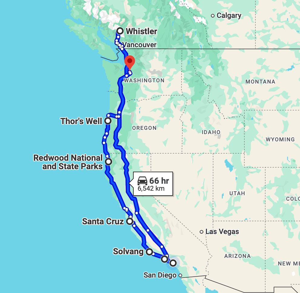 OC > Malibu, CA > Solvang, CA > Santa Cruz, CA > Folsom, CA > Mt. Shasta, CA > Sheridan, OR > Issaquah, WA >Whistler, BC > Oregon coast > Redwoods > Home.